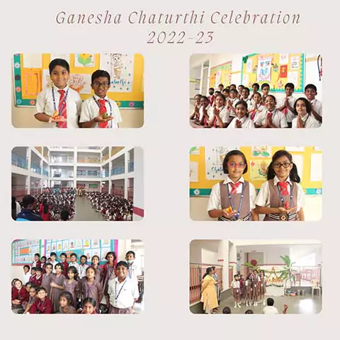 The students partook in the celebration on 1st September 2022. Students across grades 1 to 9 sang prayer songs -----shakthi sahitha ganapatim,bomma bomma tha tiaya taiya, mudakratha modakam,, mooshika vahana modaka hastha - to name a few. This was followed by the Aarthi by the Principal and the Vice-Principal. Then prasad of Channa Sundal, made by the teachers, was distributed among the the staff and students. Students relished the home-made prasad, asking for third and fourth helpings too. The students then paid their respects to the Vignahartha by each bowing down to him. They received blessings by getting the tilak from the Vice-Principal.